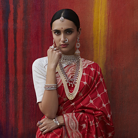 Reminiscent of the Elizabethan era, this royal choker has been crafted in diamonds, adorned in rubies and elevated with south sea pearls. A bridal piece that is elegant in every way